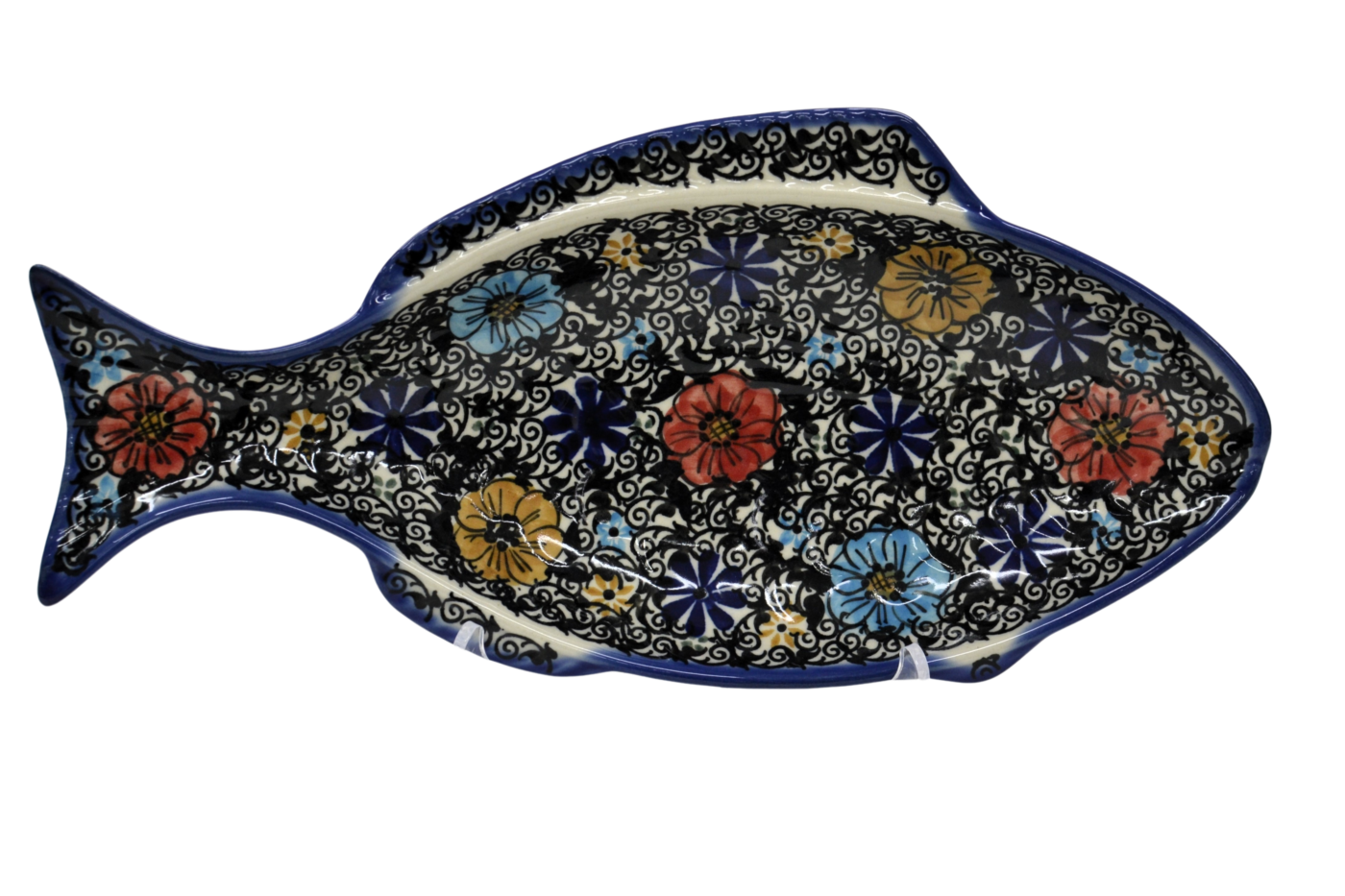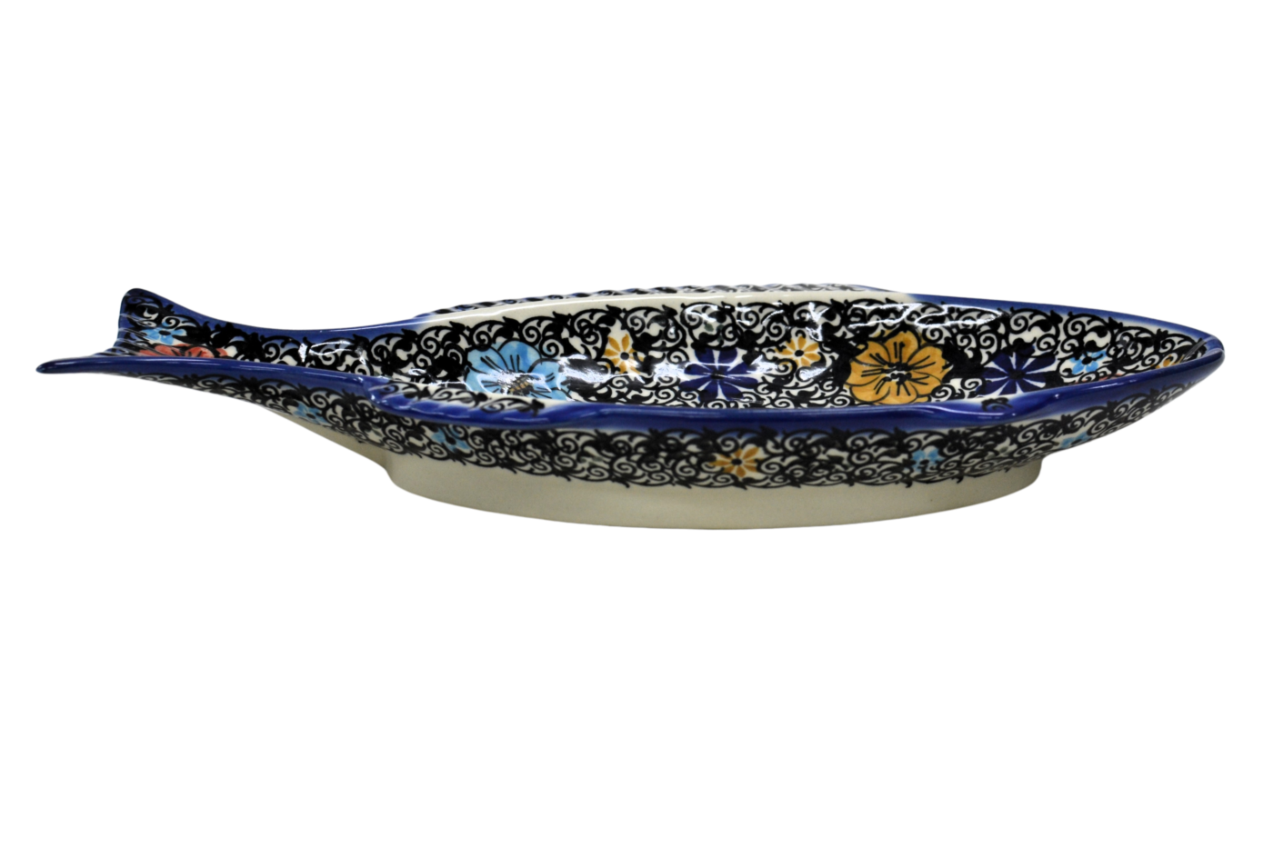 A ceramic platter from Bolesławiec for baking fish, hand-painted with unique patterns and stamp decorations. Fish-shaped dish for baking and serving fish.