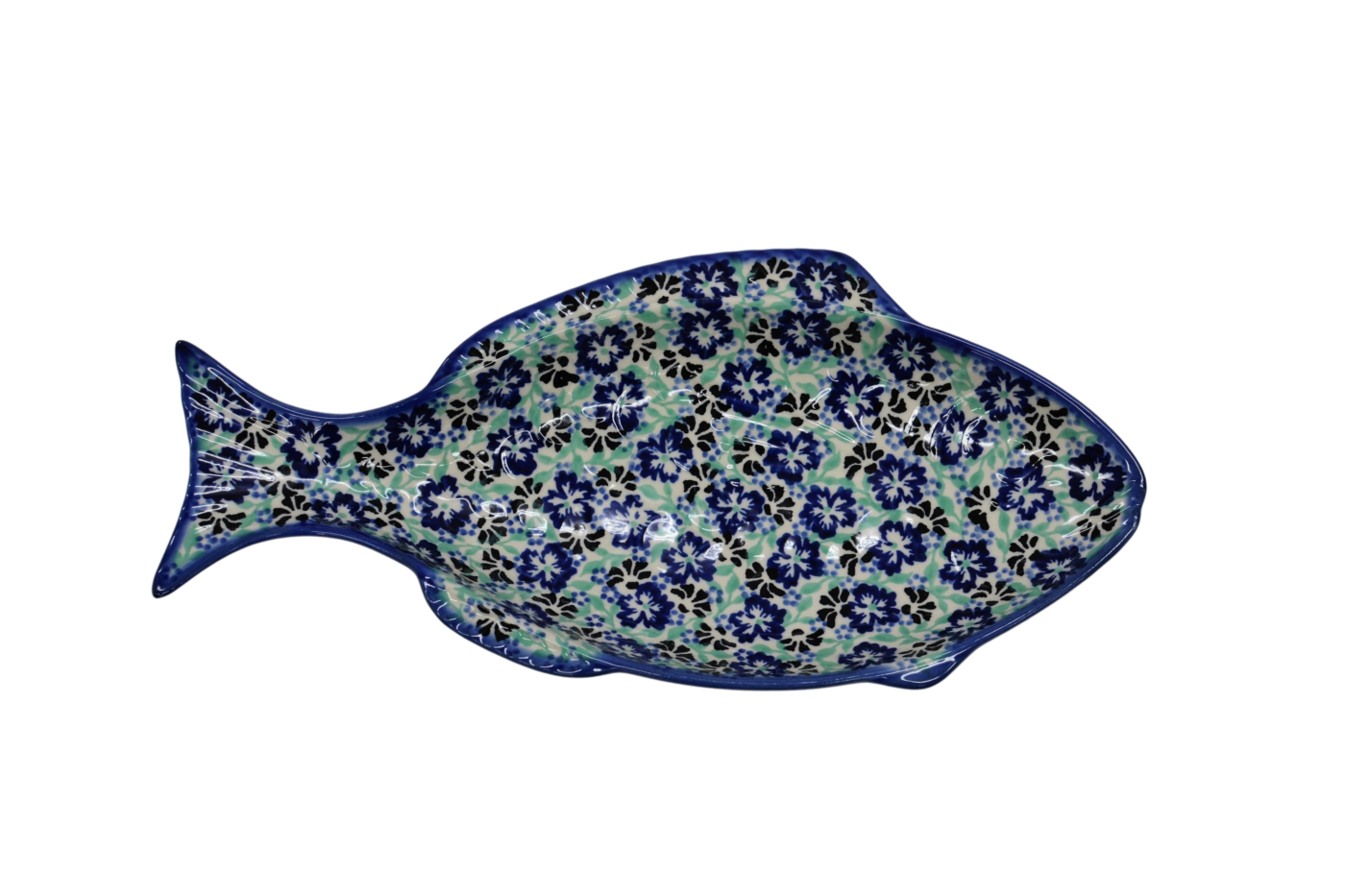 A ceramic platter from Bolesławiec for baking fish, hand-painted with unique patterns and stamp decorations. Fish-shaped dish for baking and serving fish.