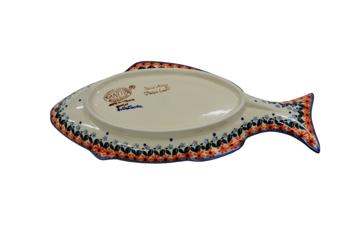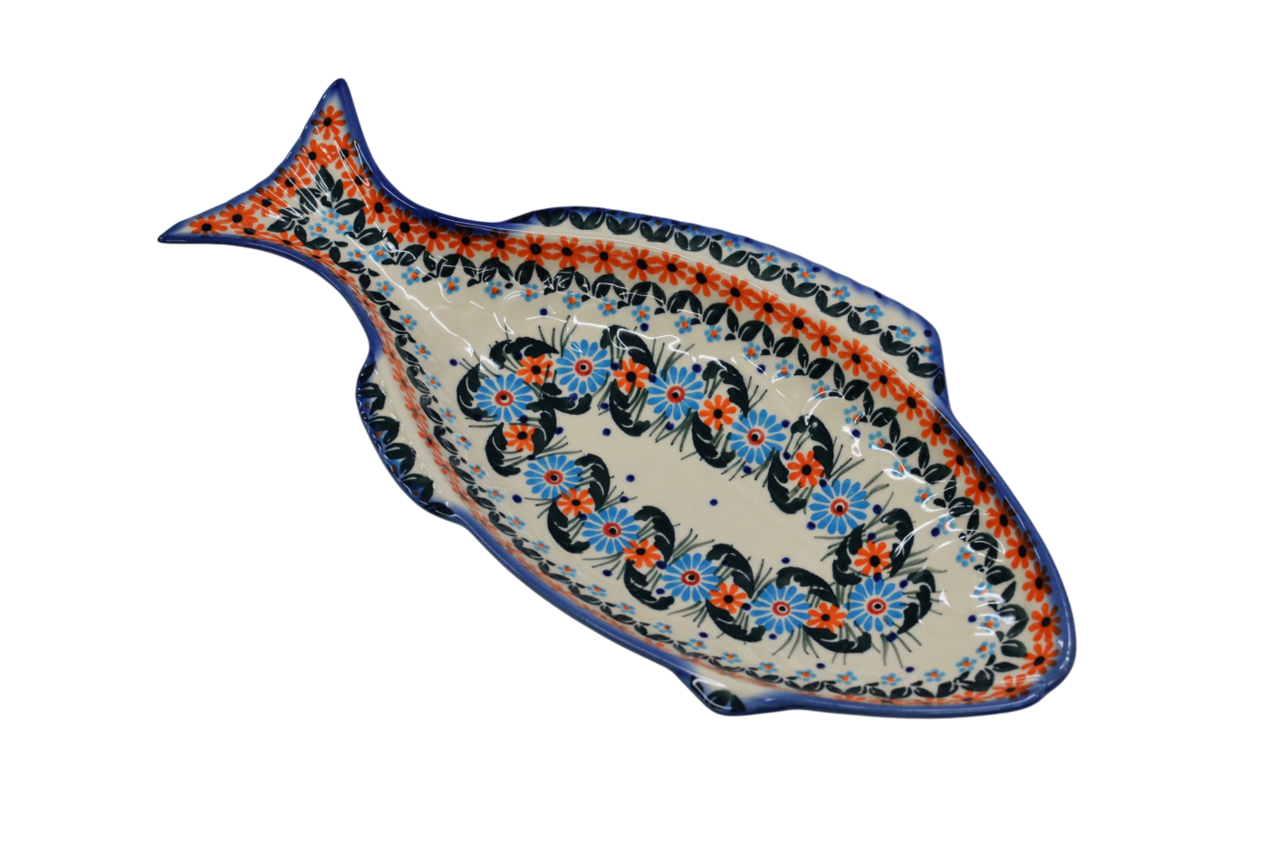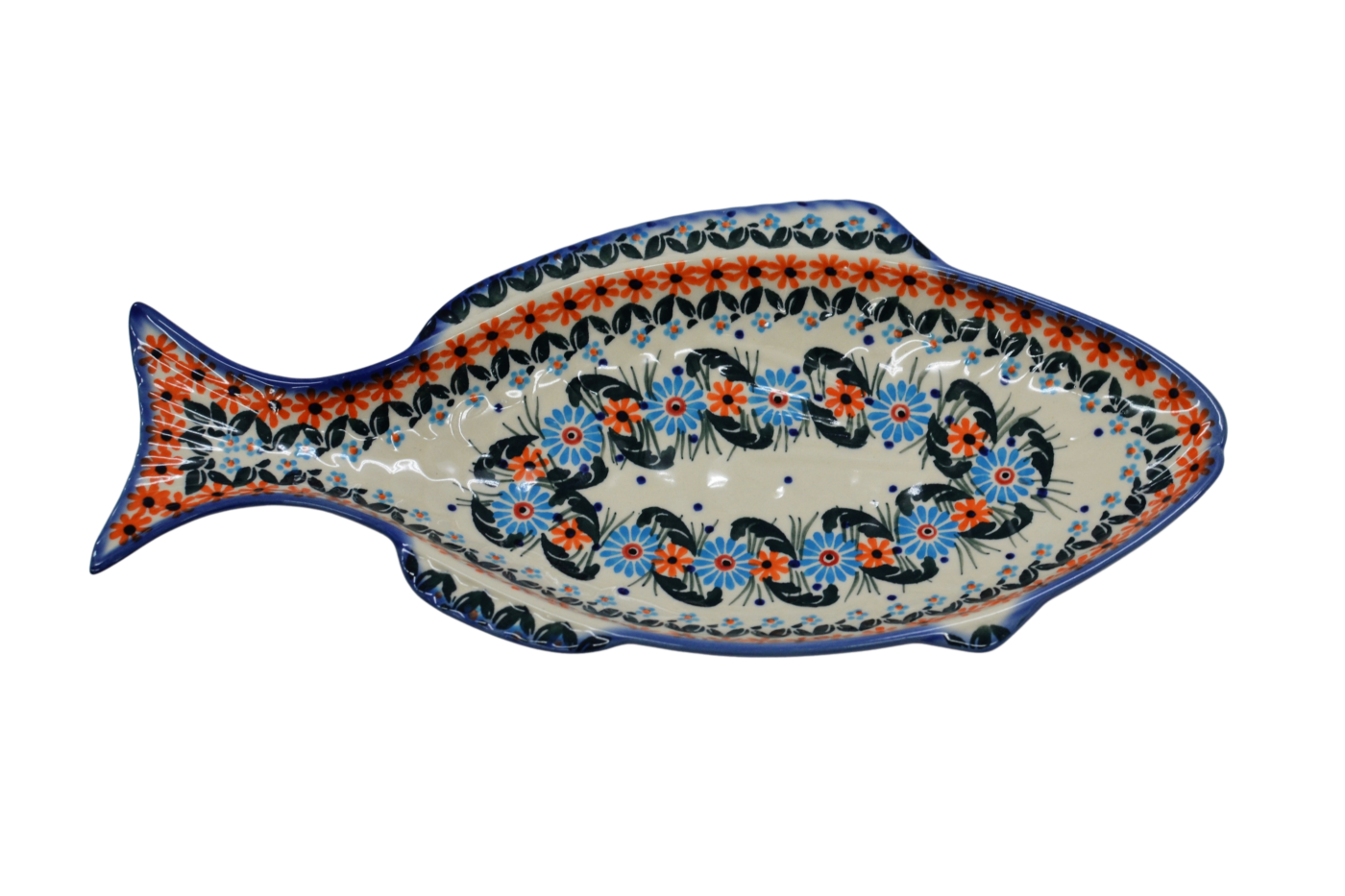 A ceramic platter from Bolesławiec for baking fish, hand-painted with unique patterns and stamp decorations. Fish-shaped dish for baking and serving fish.