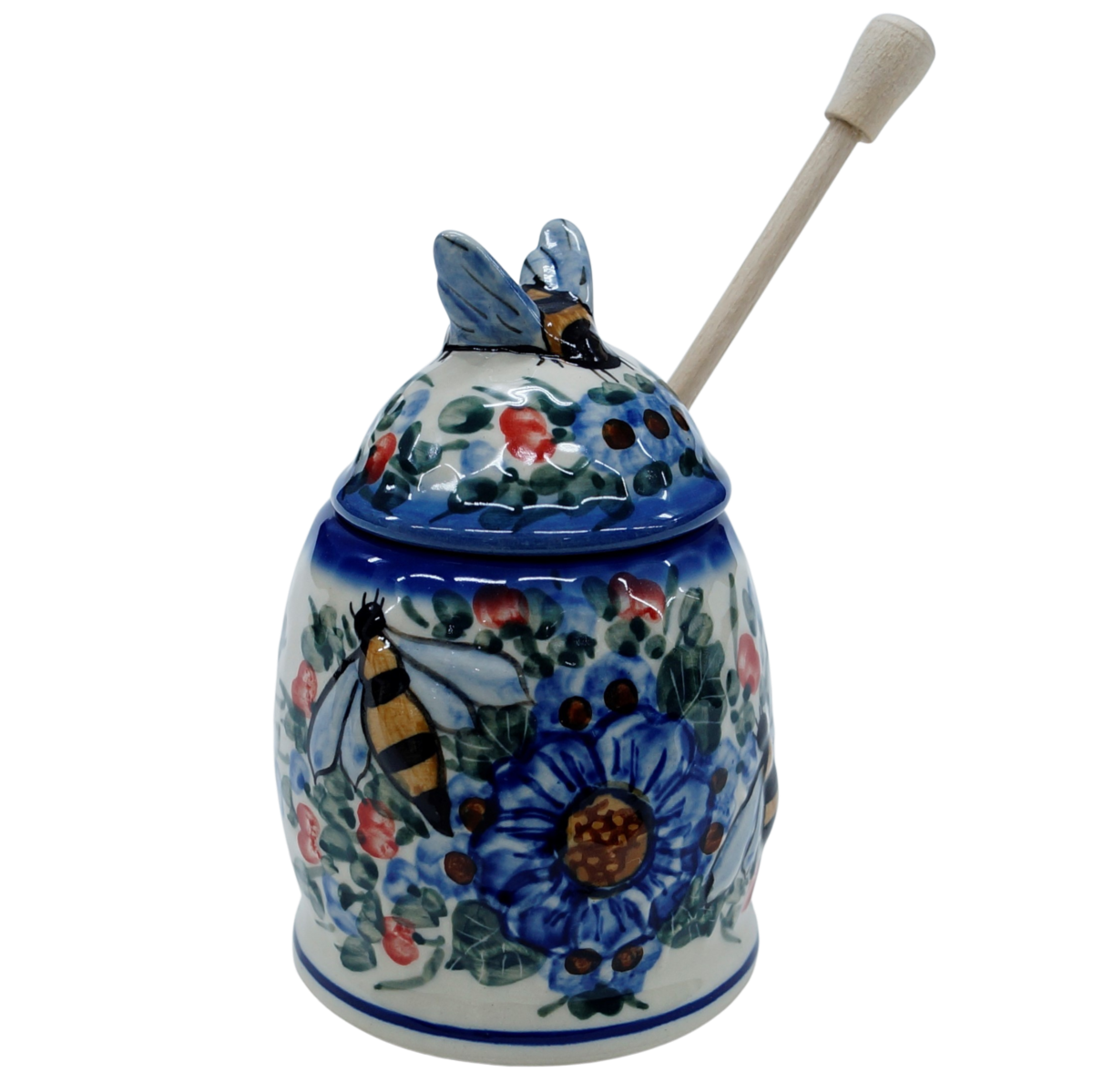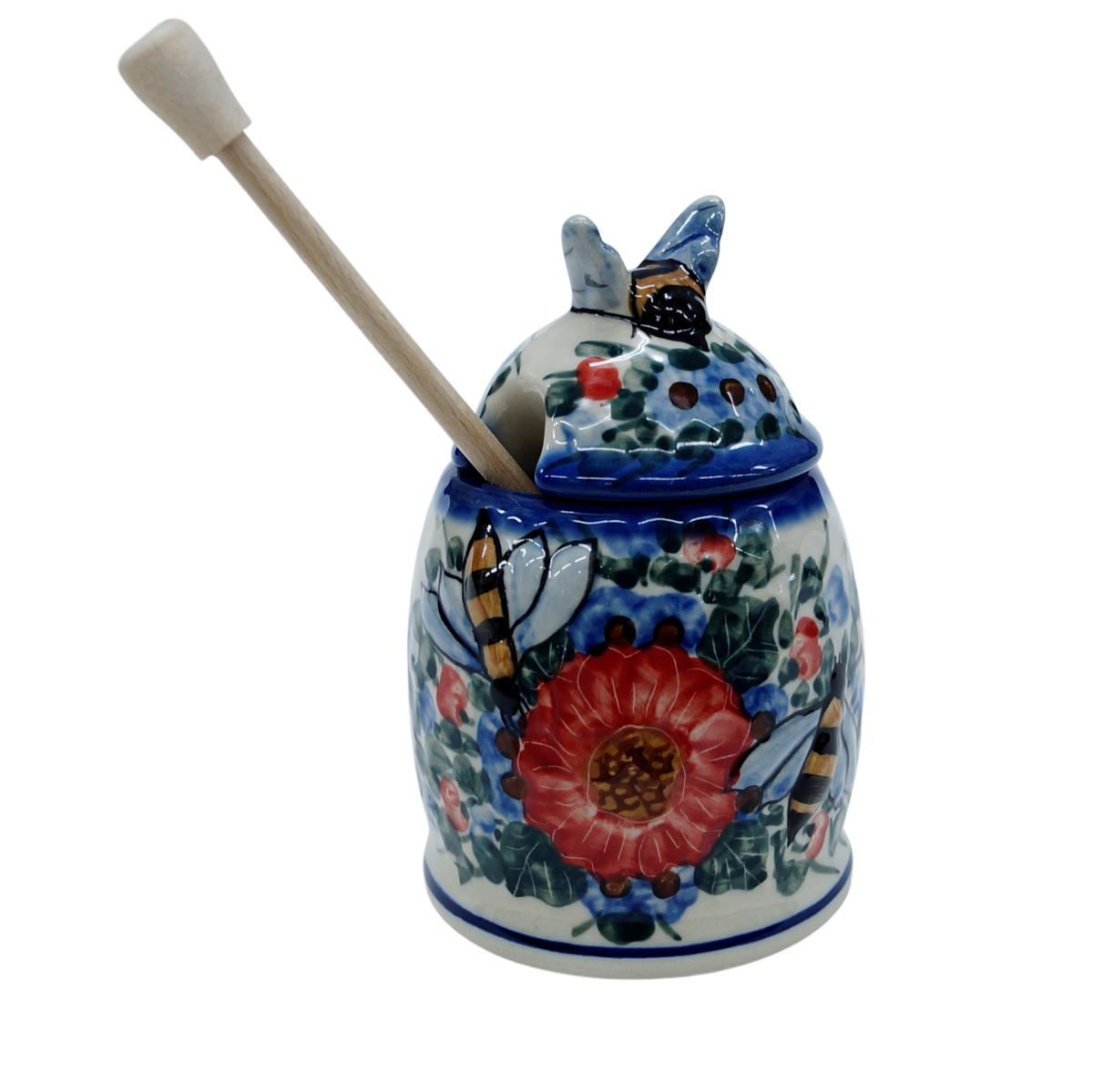 A honey container with a wooden dipper in unique artistic decorations straight from the family manufactory in Bolesławiec, the ANDY Ceramika brand.