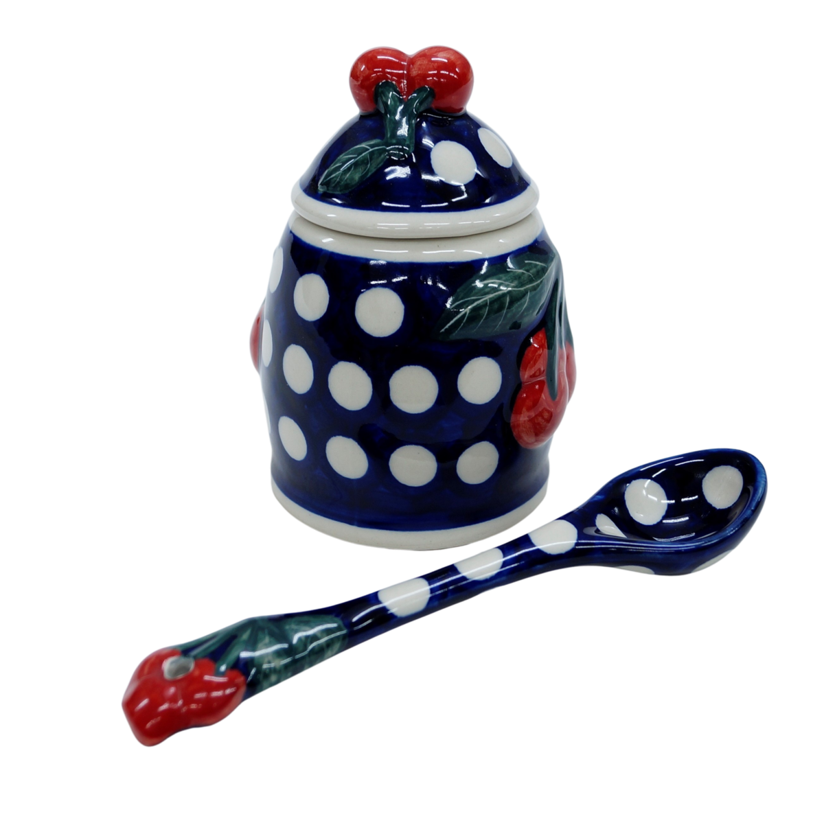 Ceramic jam container with scooping (ceramic spoon) included, which also has a cherry on top, so that it fits perfectly in the container and makes opening easier.