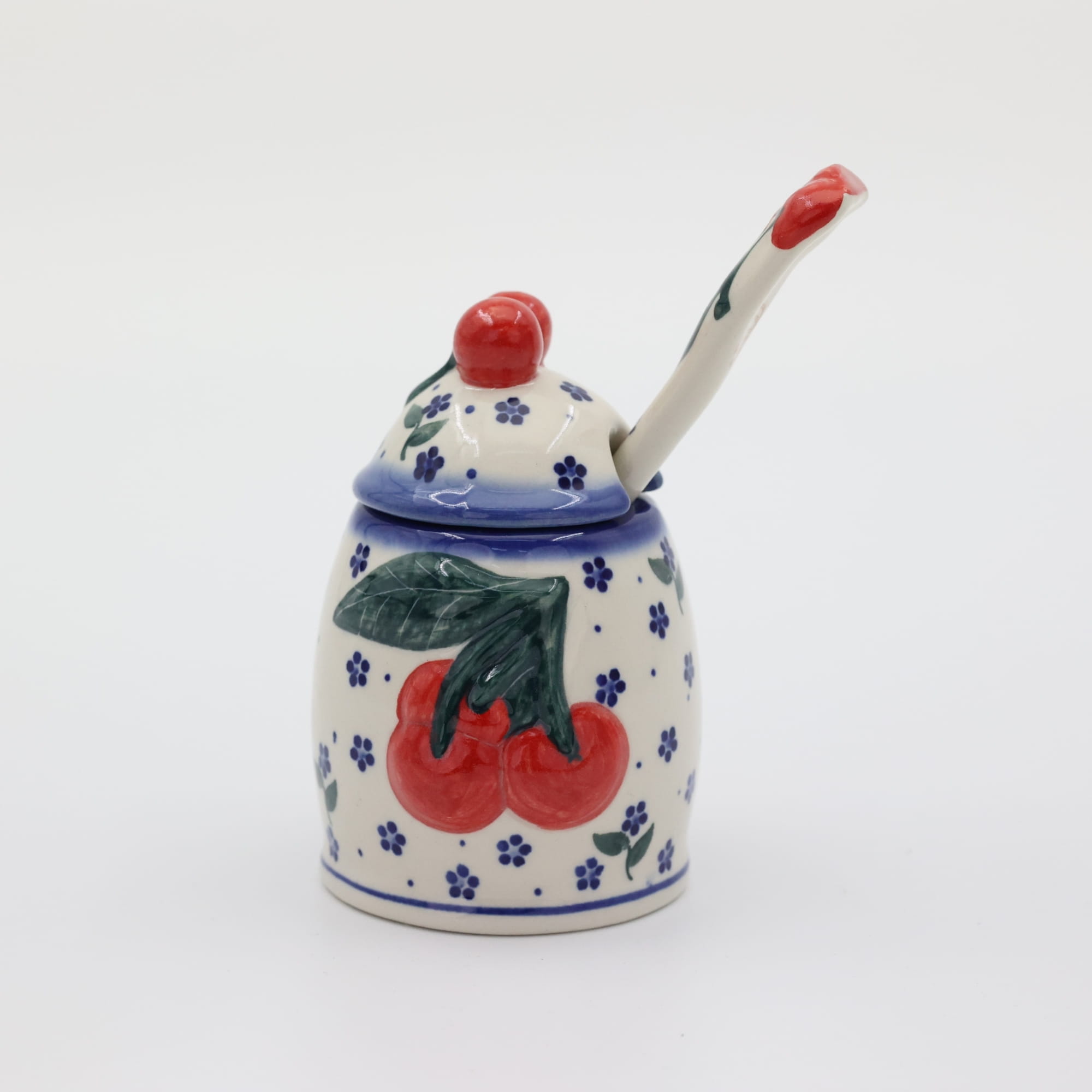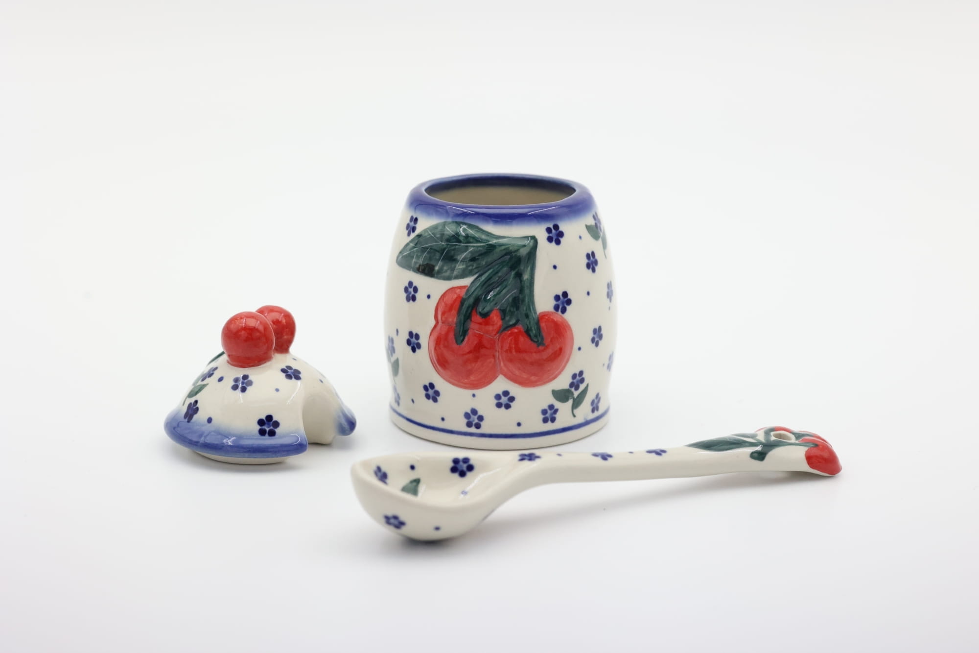 Ceramic jam container with scooping (ceramic spoon) included, which also has a cherry on top, so that it fits perfectly in the container and makes opening easier.