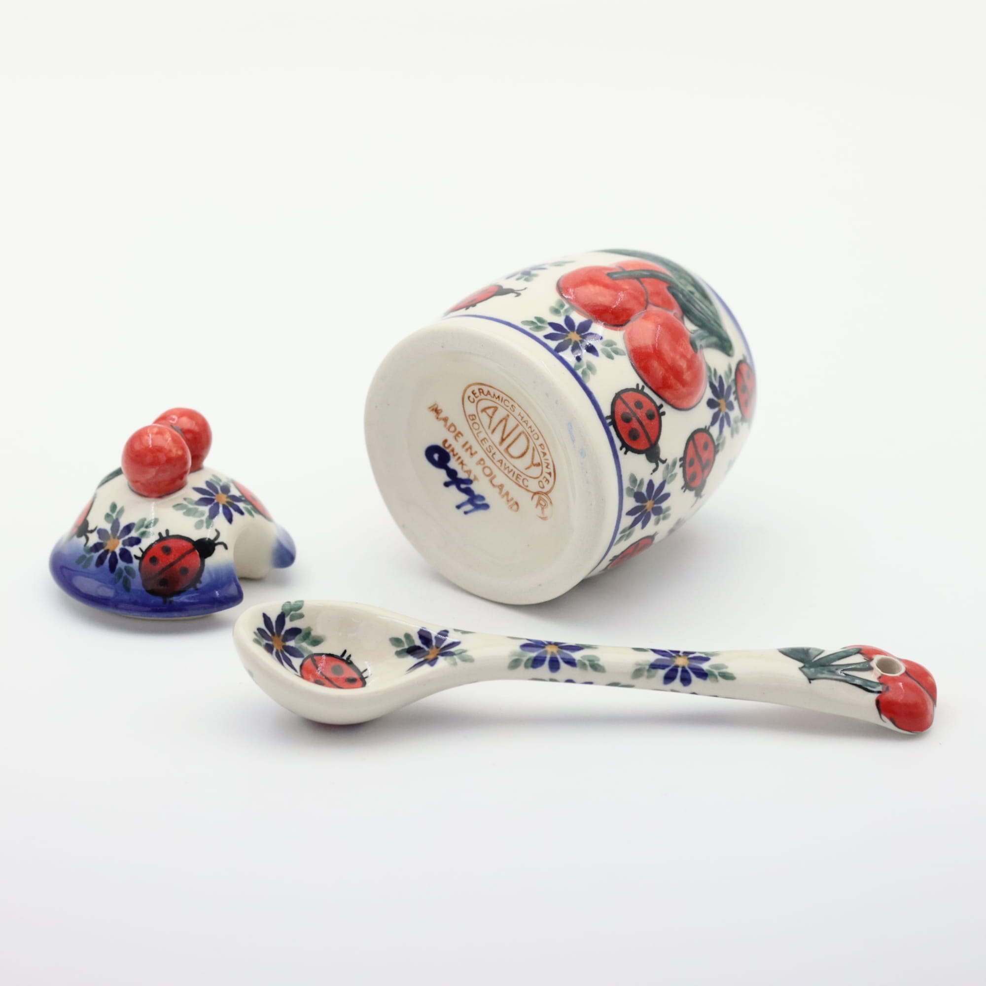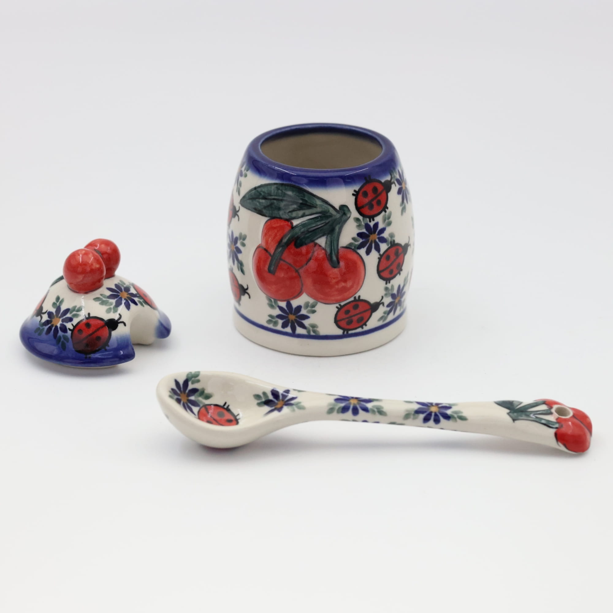 Ceramic jam container with scooping (ceramic spoon) included, which also has a cherry on top, so that it fits perfectly in the container and makes opening easier.