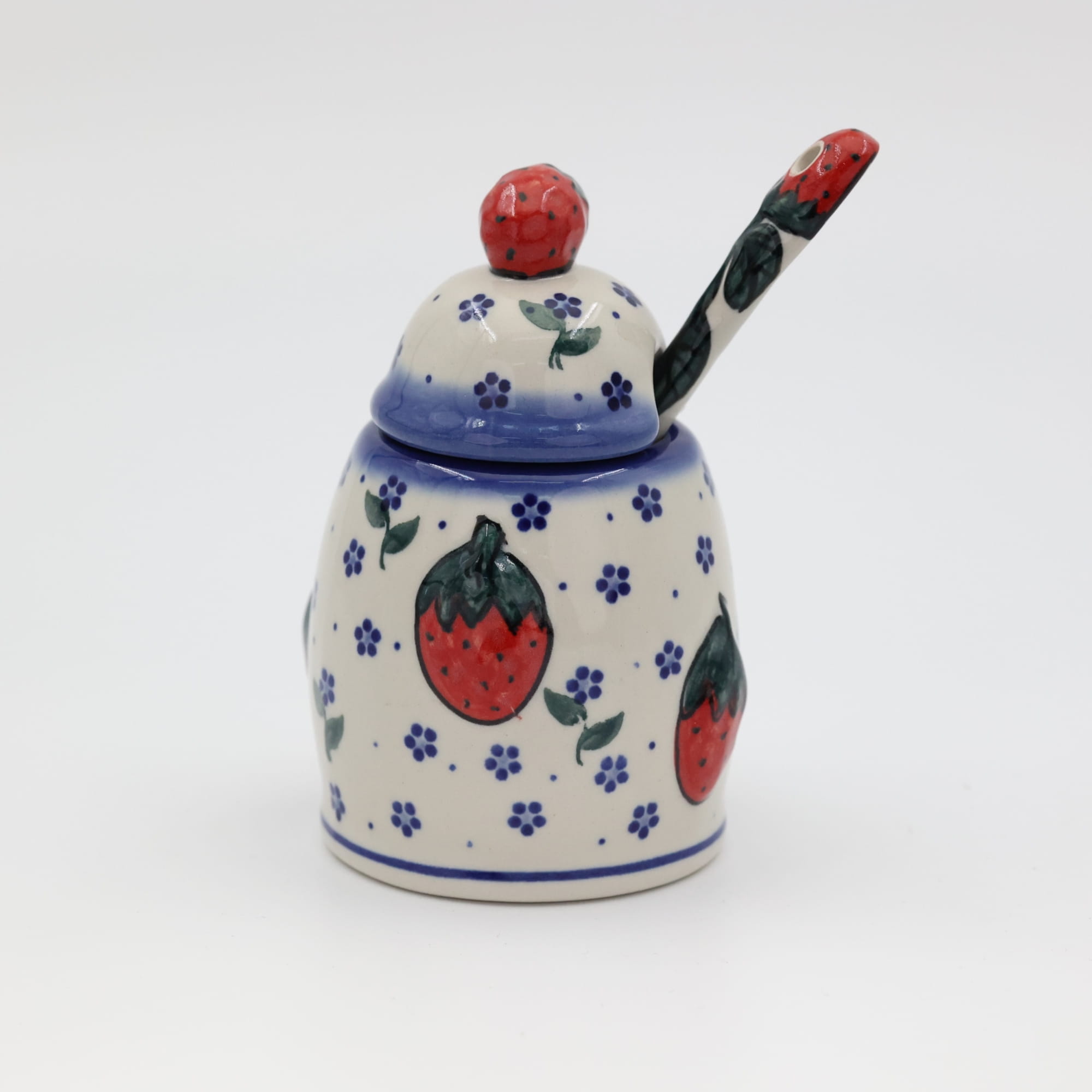 Ceramic jam container with a scooping spoon (ceramic spoon) included, which also has a strawberry in the upper part, so that it fits perfectly in the container.