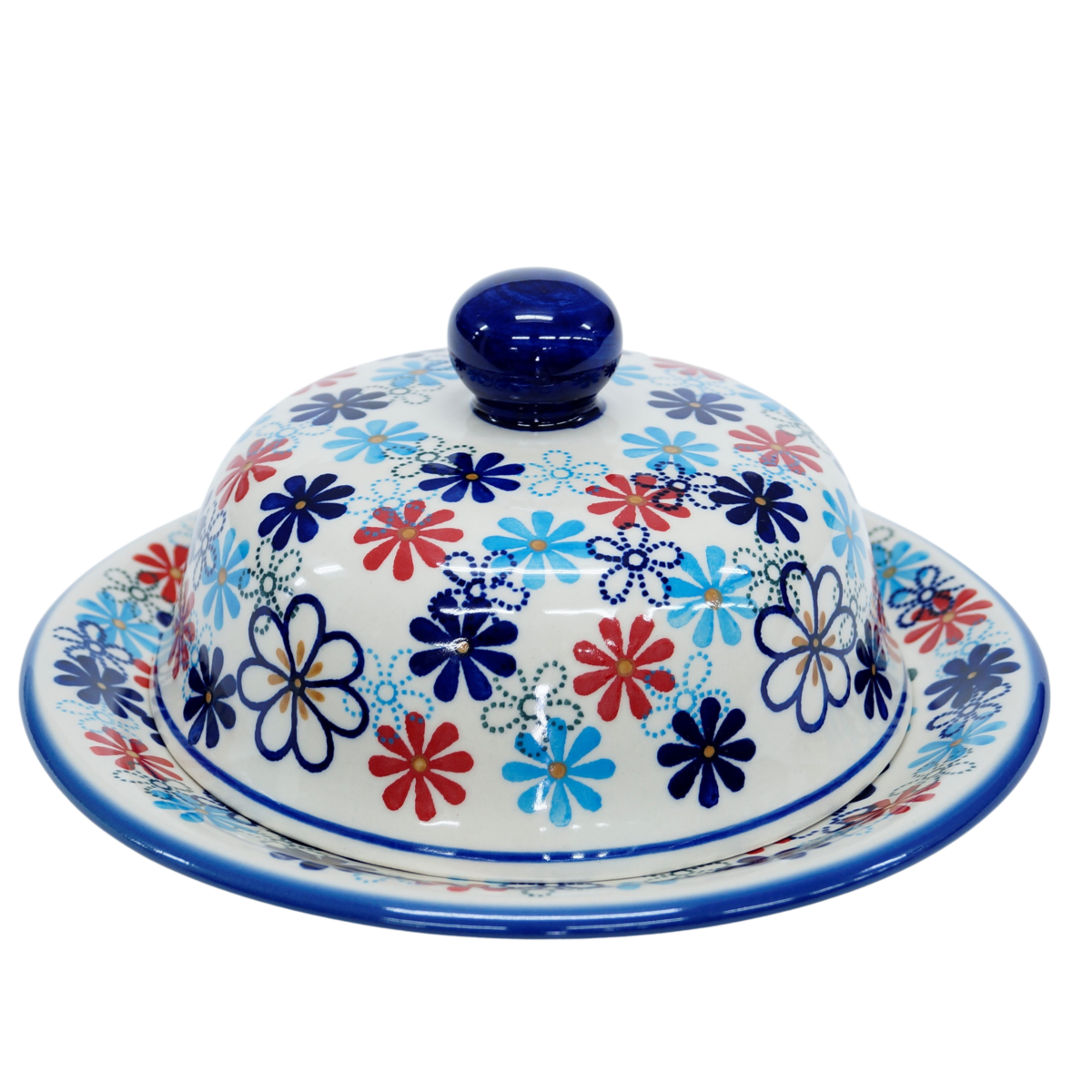 We present a new product in our offer! Hand-decorated under glaze with motifs of Bolesławiec pottery - a ceramic plate with a diameter of 26 cm with a ceramic cover.